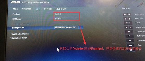 2、重启后切换到BOOT的选项,分别把fast boot和csm support由disabled改成enabled,分别开启快速启动和兼容模式;