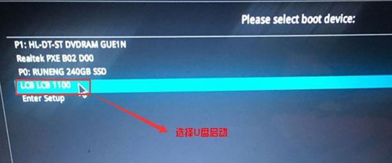4、插入U盘启动盘,重启按ESC选择识别到U盘启动项