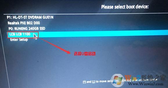 4、插入U盘启动盘,重启按ESC选择识别到U盘启动项,回车;