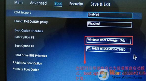 3、继续把boot option#1选项改为普通引导的,boot option#1和boot option#2硬盘启动位置对换,设置第一启动项为普通硬盘引导,带Windwos Boot Manager的为UEFI引导分区;