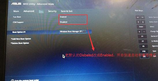 2、重启后切换到BOOT的选项,分别把fast boot和csm support由disabled改成enabled,分别开启快速启动和兼容模式;