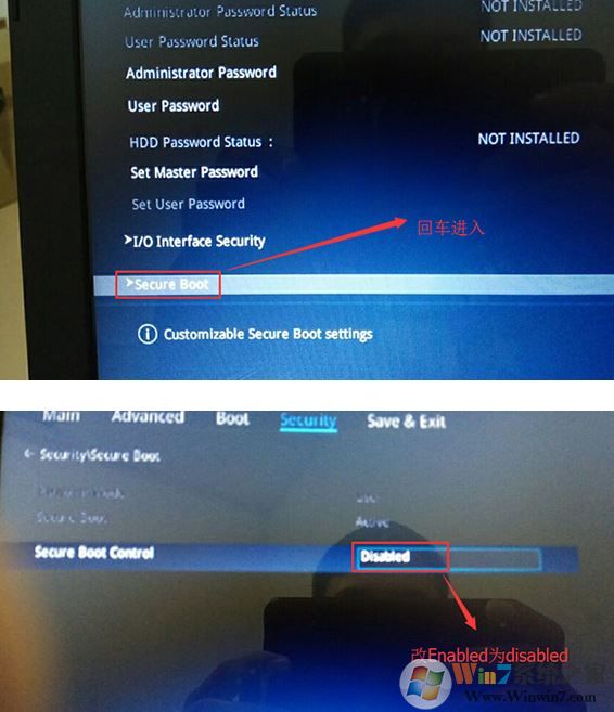 1、重启笔记本按esc进入BIOS设置,然后按F7进入高级模式,按→方向键移动到Security,选择Secure Boot,然后回车进入把Secure Boot control选enabled改为disabled关闭安全启动,然后按F10保存重启;