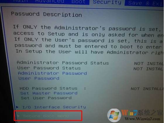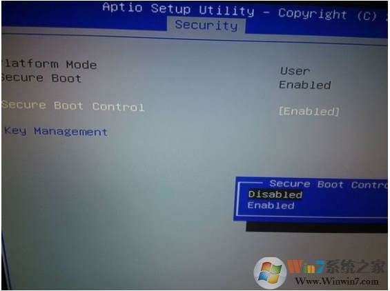1、重新启动电脑后我们按F2进入到BIOS,进入后进入security菜单,把菜单下的secure boot 的enable改成disable;(这个步骤是关闭安全启动)
