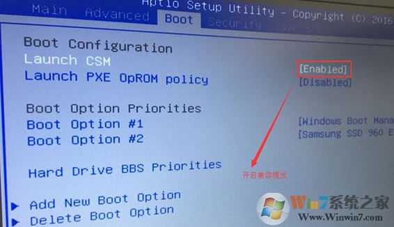 2、重启后切换到BOOT的选项,把Launch CSM由disabled改成enabled,开启兼容模式;