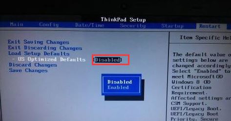 4、在Restart下,选择OS Optimized Defaults回车,改成Disabled或Other OS,接着选择Load Setup Defaults回车进行加载,然后按F10保存设置。