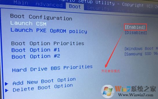 2、重启后切换到BOOT的选项,把Launch CSM由disabled改成enabled,开启兼容模式;