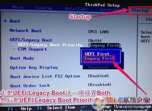 3、选择startup,在UEFI/legac boot priority下,设置为Legacy First(传统模式优先)。