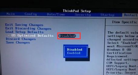 4、在Restart下,选择OS Optimized Defaults回车,改成Disabled或Other OS,接着选择Load Setup Defaults回车进行加载,然后按F10保存设置。