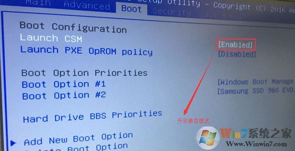 2、重启后切换到BOOT的选项,把Launch CSM由disabled改成enabled,开启兼容模式;
