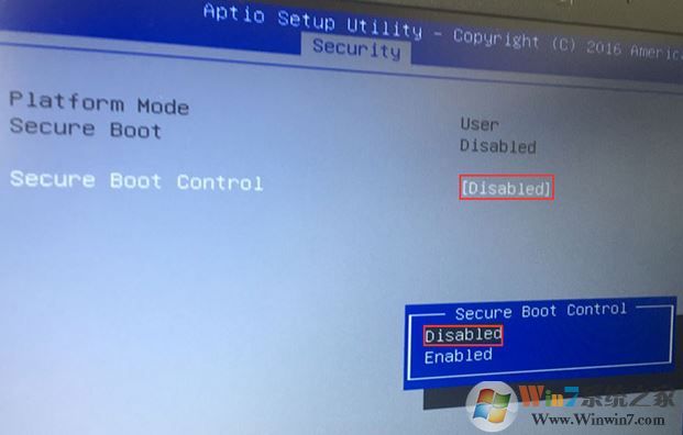4、使用方向键上下键选择 Secure Boot Control ,然后将其修改为DISabled(一步的作用是关闭微软的Secure BOOT,这个功能开启会导致不能识别U盘启动系统的安装);