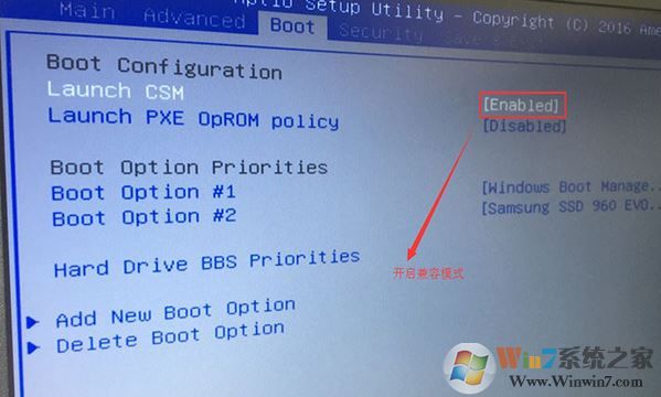 5、CSM 改成 ENabled 改成启用状态,(如果是灰色不可以选择,先按F10保存退出再次进入就可以选择了)