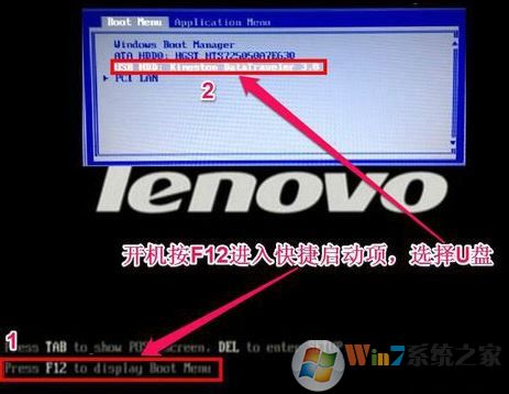 5、保存设置后自动重启进入LOGO画面时,一直按F12,选择U盘启动,如下图所示:
