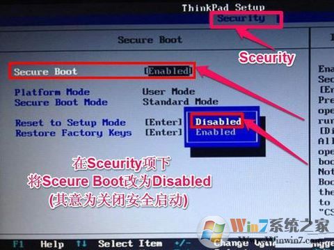 2、按→方向键移动到Security,将secure boot改成disabled,关闭安全启动,如图所示: