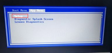 1、重启笔记本按F12,按TAB键切换栏目到"App Menu",然后选择"setup"进入BIOS设置,或是看到lenovo或ThinkPad标识后多次按Enter回车,听到报警声后等待下一画面,然后按F1或Fn+ F1进入BIOS主界面。如下图所示: