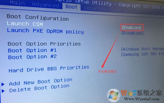 2、重启后切换到BOOT的选项,把Launch CSM由disabled改成enabled,开启兼容模式;