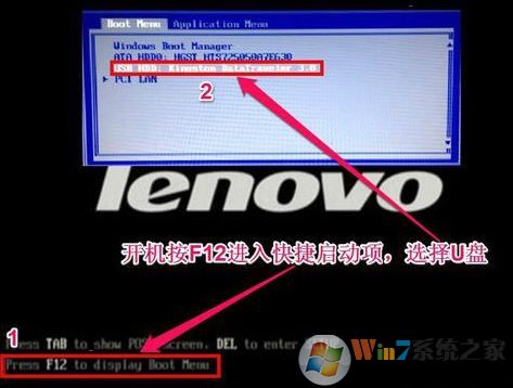 5、保存设置后自动重启进入LOGO画面时,一直按F12,选择U盘启动,如下图所示;