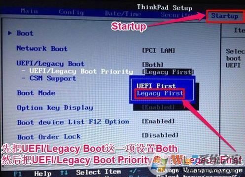 3、选择startup,在UEFI/legac boot priority下,设置为Legacy First(传统模式优先)。