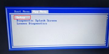 1、重启笔记本按F12,按TAB键切换栏目到"App Menu",然后选择"setup"进入BIOS设置,或是看到lenovo或ThinkPad标识后多次按Enter回车,听到报警声后等待下一画面,然后按F1或Fn+ F1进入BIOS主界面。如下图所示;