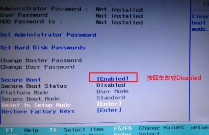 1、重启笔记本电脑,然后不停按按F2或(FN+F2)进入BIOS,按→方向键切换到Security,选择Secure Boot回车设置成Disabled;