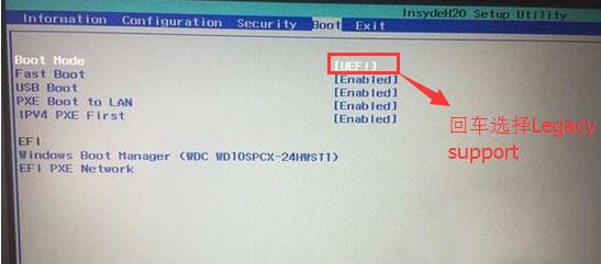 4、切换到Boot,把Boot Mode从UEFI改成Legacy Support;