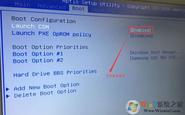 2、重启后切换到BOOT的选项,把Launch CSM由disabled改成enabled,开启兼容模式;