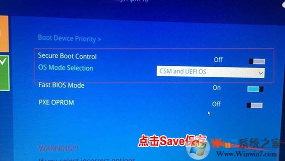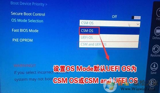 3、关闭安全启动后,BOOT选项中就会多出一个OS Mdoe Selection选项,我们将默认的UEFI OS改为CSM OS或CSM and UEFI OS,如下图所示;