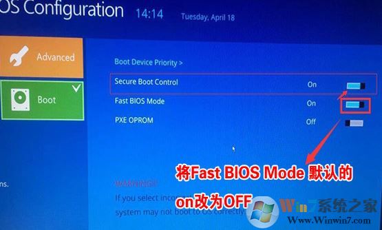 4、将Fast BIOS Mode后面的开关关掉(On变成Off),如下图所示;