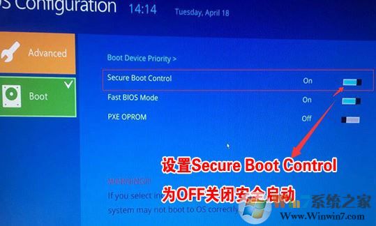 2、切换到BOOT的选项,将Secure Boot Control后面的开关关掉(On变成Off),关闭安全启动,该步是改WIN7的重要一步,如下图所示;