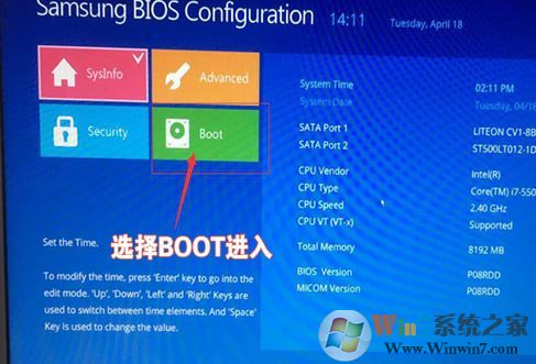 1、重启笔记本一直按F2进入BIOS设置,进入BIOS界面后,点击进入BOOT的选项(可以用鼠标操作),如下图所示;
