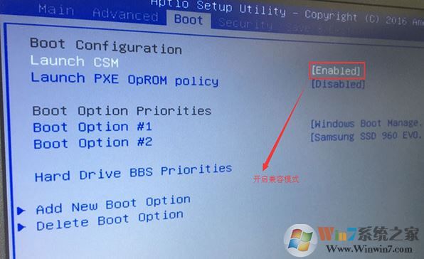 2、重启后切换到BOOT的选项,把Launch CSM由disabled改成enabled,开启兼容模式;