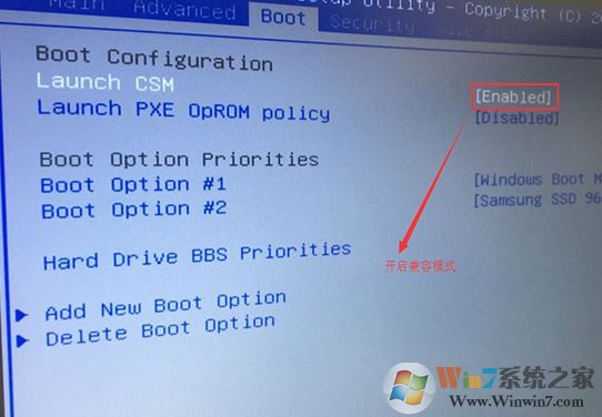 2、重启后切换到BOOT的选项,把Launch CSM由disabled改成enabled,开启兼容模式;