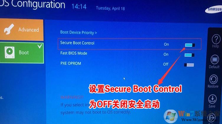 2、切换到BOOT的选项,将Secure Boot Control后面的开关关掉(On变成Off),关闭安全启动,该步是改WIN7的重要一步,如下图所示;