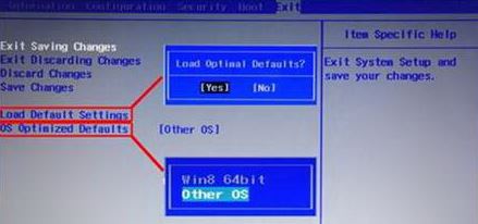 2、进入BIOS设置界面后,按下键盘上“→”键将菜单移动至“EXIT“项目,按下键盘上“↓”按键选择到“OS Optimized Defaults”选项,按下“回车”键打开该选项的设置菜单,按下键盘上“↓”按键,将该选项默认的“Win8 64bit”修改为“Others”之后,按下“回车”键确认。之后按下键盘上“↑”按键选择到“Load Default Setting”选项,按下回车键启动恢复BIOS默认功能窗口,在该窗口中直接按下笔记本键盘上的“回车”键启动BIOS恢复默认功能。之后再按下笔记本键盘上“F10”键或“Fn+F10”键启动BIOS保存设置窗口,在该窗口中直接按下笔记本键盘上的“回车”键,启动BIOS保存设置并重新启动计算机功能。