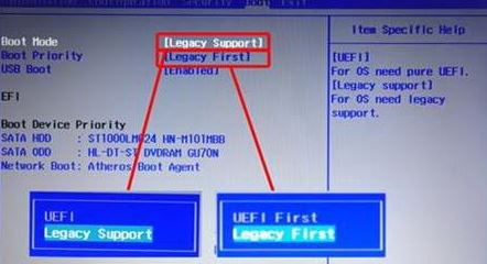 3、在计算机重新启动至“Lenovo”LOGO画面时,并按下笔记本键盘上“F2”键或“Fn+F2”键进入笔记本的BIOS设置界面将按下键盘上“→”键菜单移动至“Boot”项目,找到该项目下的“Boot Mode”选项,按下“回车”键打开该选项的设置菜单,按下键盘上“↓”按键,将该选项默认的“UEFI”修改为“Legacy Support”之后按下“回车”键确认,再按下键盘上“↓”按键选择“Boot Priority”选项,按下键盘上“↓”按键将该选项默认的“UEFI First”修改为“Legacy First”之后按下“回车”键确认。之后再按下笔记本键盘上“F10”键或“Fn+F10”键启动BIOS保存设置窗口,在该窗口中直接按下笔记本键盘上的“回车”键启动BIOS保存设置并重新启动计算机功能。