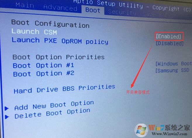 2、重启后切换到BOOT的选项,把Launch CSM由disabled改成enabled,开启兼容模式;