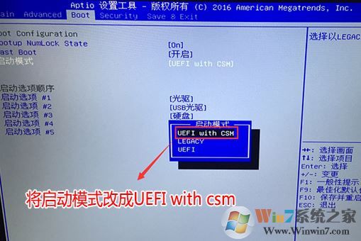1、开机一直按按DEL进入BIOS界面,然后利用方向键上下左右来选择选项,切换到选择Boot选项,然后利用方向键的下键移动启动模式(Boot mode select)将UEFI改成UEFI with CSM,如图: