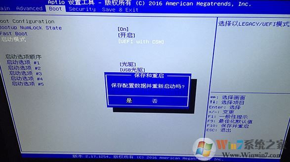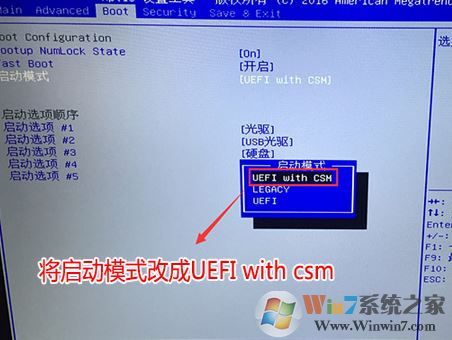 1、开机一直按按DEL进入BIOS界面,然后利用方向键上下左右来选择选项,切换到选择Boot选项,然后利用方向键的下键移动启动模式(Boot mode select)将UEFI改成UEFI with CSM,如图所示: