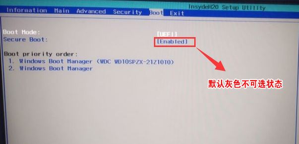 1、开机一直按F2进入BIOS,按F2进入BIOS界面,首先我们要关闭安全启动(secure boot选项默认为enabled),切换BOOT项后发现secure boot灰色不可选状态,如图所示: