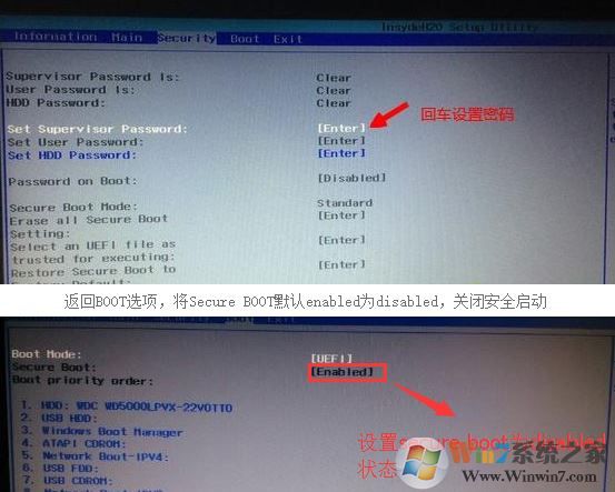 2、如果Secure Boot灰色无法设置,则转到Security,选择Set Supervisor Password回车设置密码,再返回BOOT选项,将Secure BOOT默认enabled为disabled,(注:改完secure boot后再设置密码为空即可,要不每次进BIOS都要设置)如下图所示;