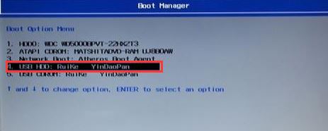 5、插入U盘启动盘,重启时不停的按下f12,打开Boot Manager,选择USB HDD回车从U盘启动,如下图所示;