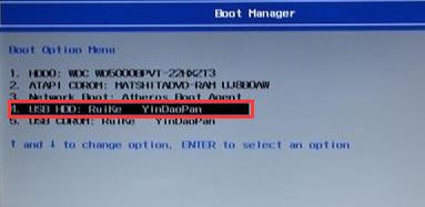5、插入U盘启动盘,重启时不停的按下f12,打开Boot Manager,选择USB HDD回车从U盘启动,如下图所示;