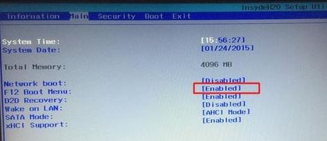 4、转到Main,选择F12 Boot Menu回车,设置为Enabled,按F10选择Yes回车保存修改,如下图所示;