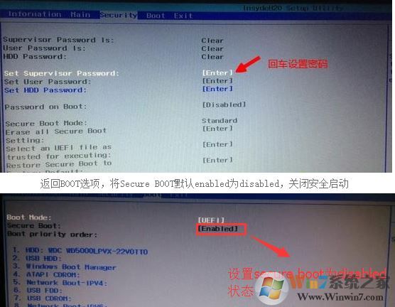 2、如果Secure Boot灰色无法设置,则转到Security,选择Set Supervisor Password回车设置密码,再返回BOOT选项,将Secure BOOT默认enabled为disabled,(注:改完secure boot后再设置密码为空即可,要不每次进BIOS都要设置)如下图所示;