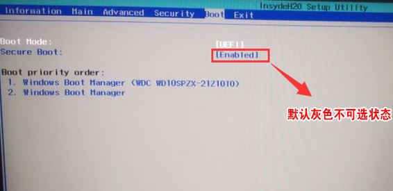 1、开机一直按F2进入BIOS,按F2进入BIOS界面,首先我们要关闭安全启动(secure boot选项默认为enabled),切换BOOT项后发现secure boot灰色不可选状态,如下图所示;