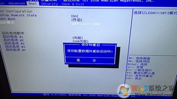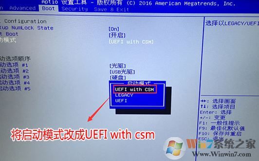 1、开机一直按按DEL进入BIOS界面,然后利用方向键上下左右来选择选项,切换到选择Boot选项,然后利用方向键的下键移动启动模式(Boot mode select)将UEFI改成UEFI with CSM如下图所示;