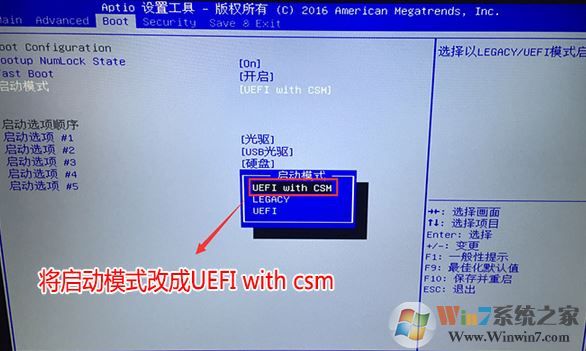 1、开机一直按按DEL进入BIOS界面,然后利用方向键上下左右来选择选项,切换到选择Boot选项,然后利用方向键的下键移动启动模式(Boot mode select)将UEFI改成UEFI with CSM如下图所示;