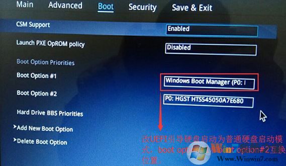 4、继续把boot option#1选项改为普通引导的,boot option#1和boot option#2硬盘启动位置对换,设置第一启动项为普通硬盘引导,带Windwos Boot Manager的为UEFI引导分区,然后按F10保存设置;