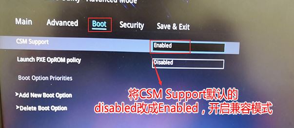 3、再切换到BOOT的选项,把CSM support由disabled改成enabled,开启兼容模式,;