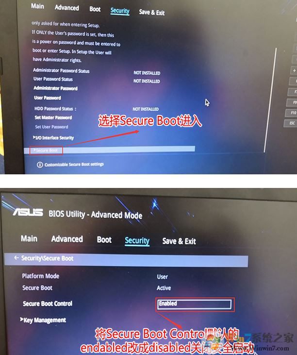 2、进入高级模式后,按→方向键移动到Security,选择Secure Boot,然后回车进入把Secure Boot control选enabled改为disabled关闭安全启动;