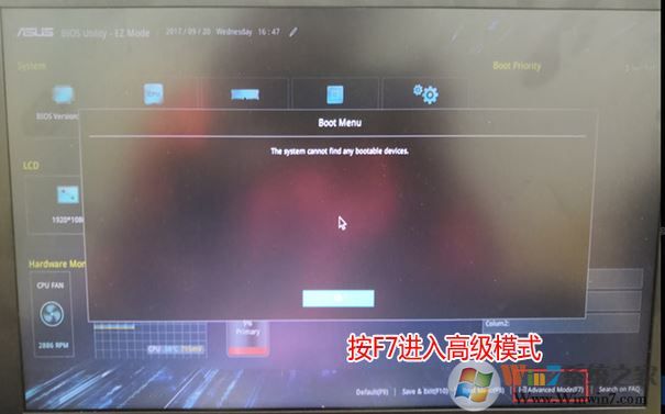 1、重启笔记本按esc进入BIOS设置,然后按F7进入高级模式,如下图所示;